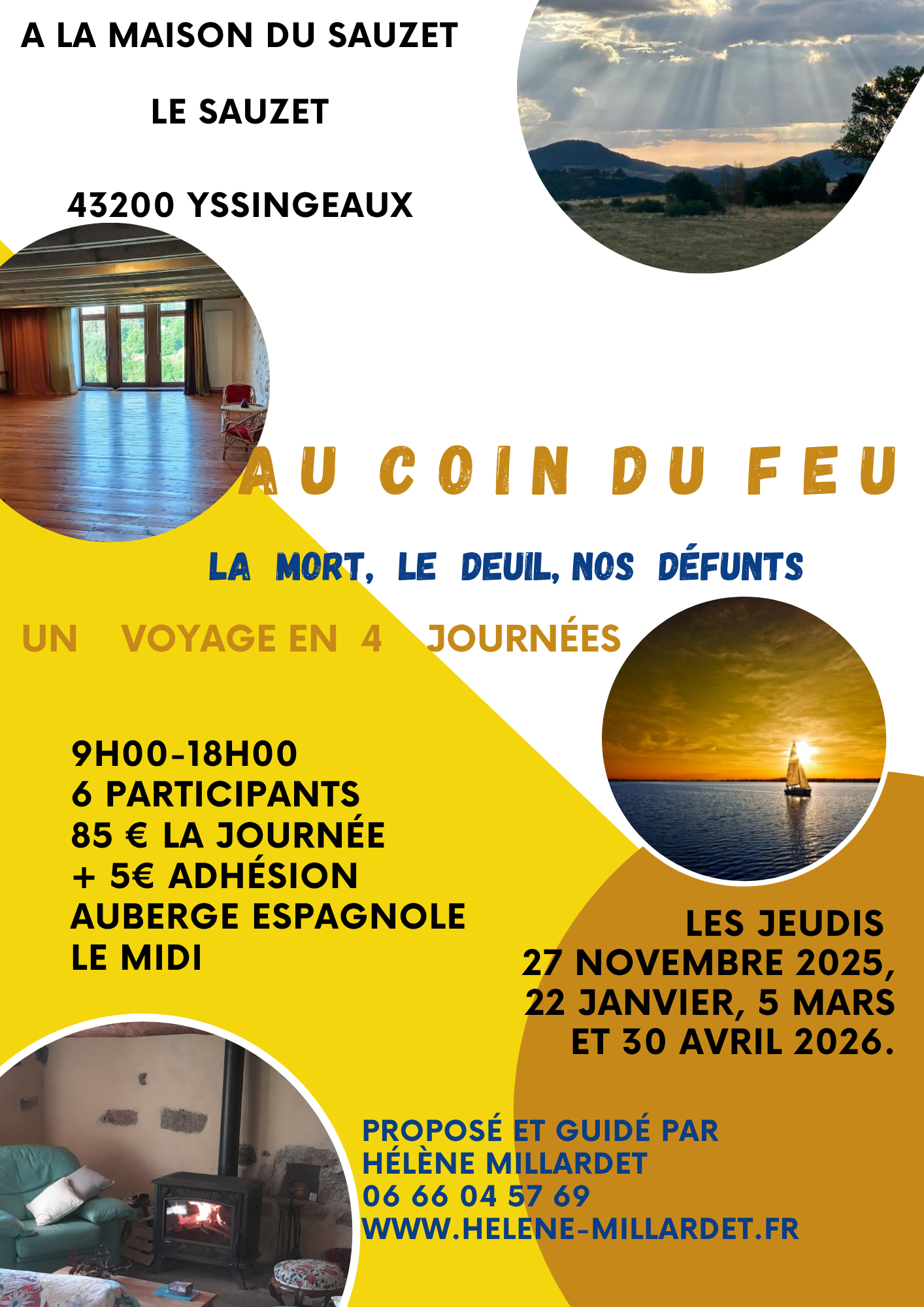 Dates : les jeudis 27 novembre, 22 janvier, 5 mars et 30 avril. Tarif : 85 euros la journée + 5 € adhésion Emergessences. 6 participants. Horaires : 9H00-17H30 Repas en mode auberge espagnole. Par respect pour le groupe, pour l’organisatrice, et pour soi-même, il est demandé de s’engager financièrement sur la totalité du …